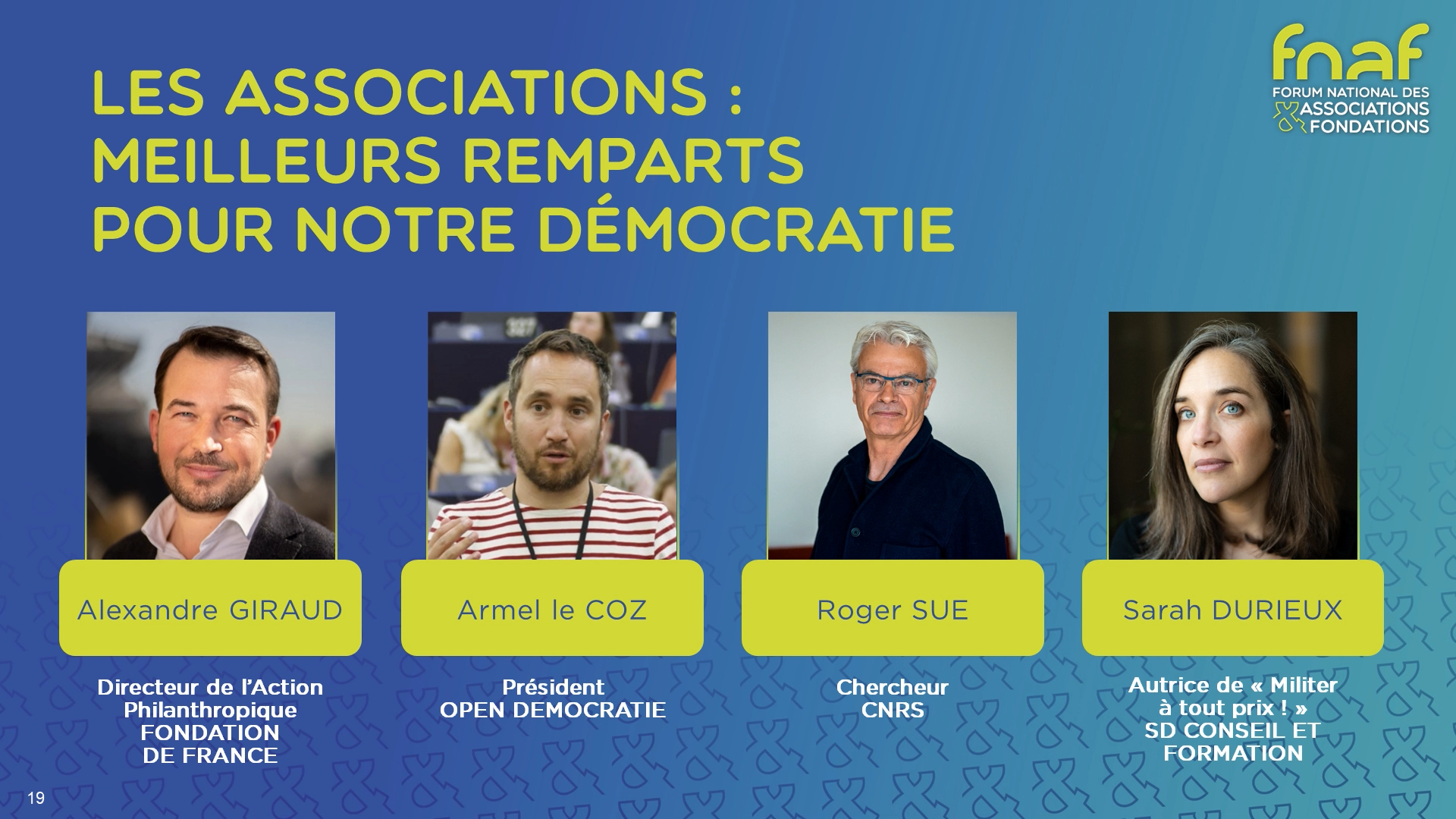 Clôturez le Forum National des Associations et Fondations avec une table ronde pleine d’espoir, où dirigeants, chercheurs et acteurs de la philanthropie explorent comment les associations et fondations renforcent notre démocratie, encouragent l’engagement citoyen et construisent un futur collectif plus juste. Avec Armel Le Coz, Roger Sue, Alexandre Giraud et Sarah Durieux.