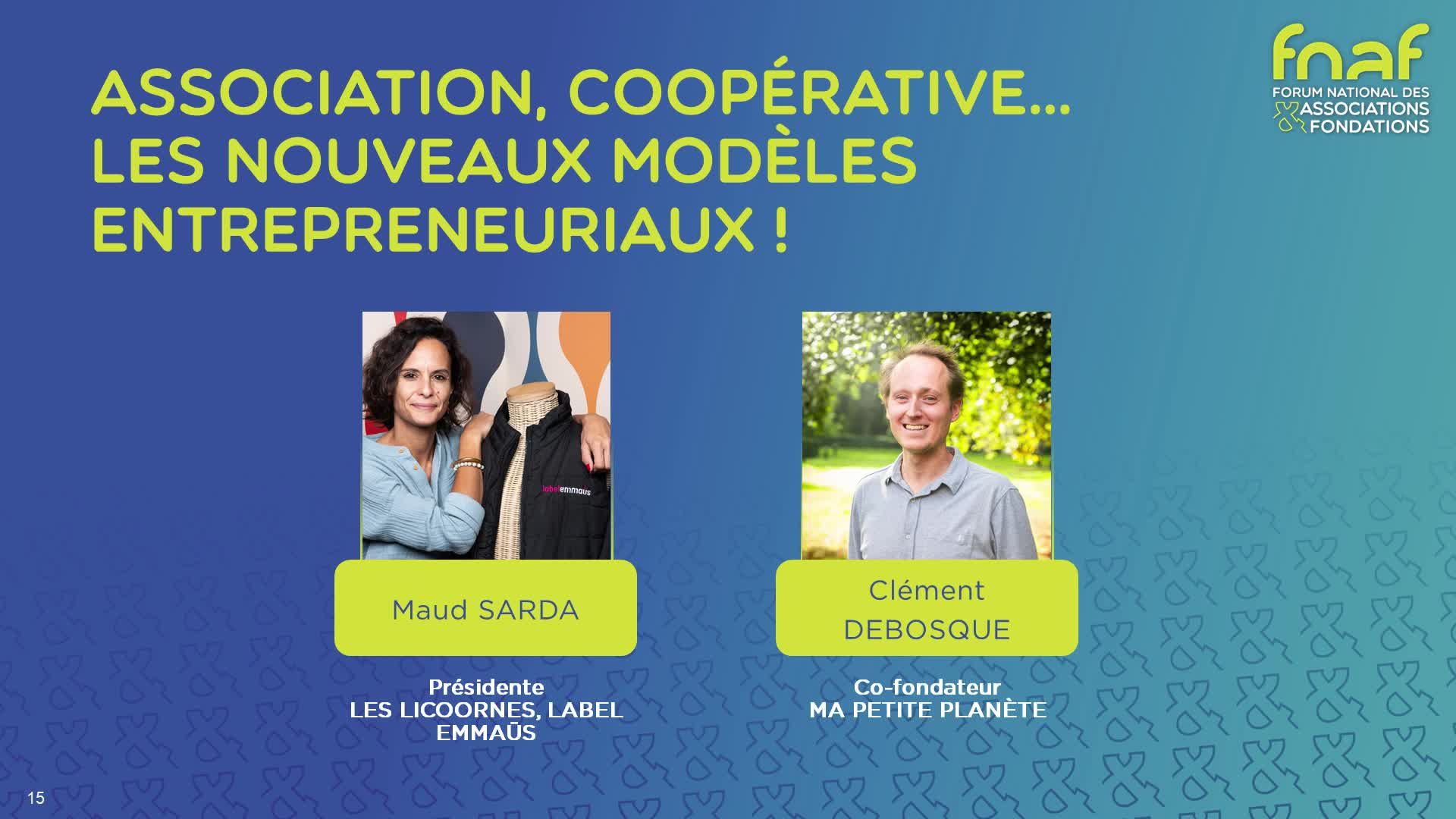 À l’heure où l’entrepreneuriat social et les modèles collectifs se réinventent, cette table ronde mettra en lumière les nouvelles formes d’organisation porteuses de sens et d’impact. Avec Maud Sarda et Clément Debosque, découvrez comment coopératives, associations et entreprises à mission redéfinissent les règles du jeu économique au service du bien commun.