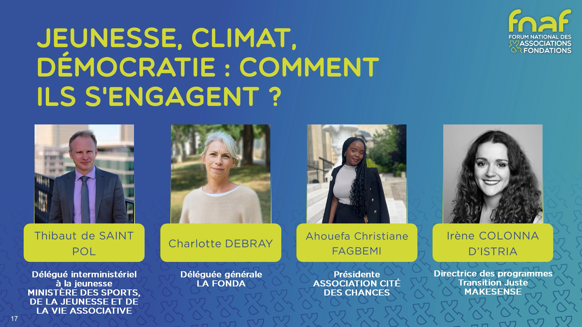 Cette table ronde nous aide à comprendre et accompagner l’engagement des jeunes sur le climat et la démocratie. Avec Christiane Fagbemi, Charlotte Debray et Irène Colonna d’Istria, découvrez des exemples concrets et des pistes pour renforcer l’impact de nos actions auprès de la jeunesse.